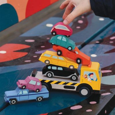 Siedem niewielkich samochodzików, które można układać jeden na drugim – balansując je na platformie dużej ciężarówki. Prosta koncepcja, która potrafi wciągnąć dziecko na długi czas. To zabawa wymagająca skupienia, precyzji, ale też wyczucia i cierpliwości. Rozwija motorykę małą, koordynację wzrokowo-ruchową i poczucie równowagi – a do tego dostarcza dużo radości z każdej udanej konstrukcji. Po ćwiczeniach zręcznościowych ciężarówka zmienia się w pojazd gotowy do dalszej zabawy – może zawieźć autka na wyścigi, do warsztatu albo przez całe dziecięce miasto.