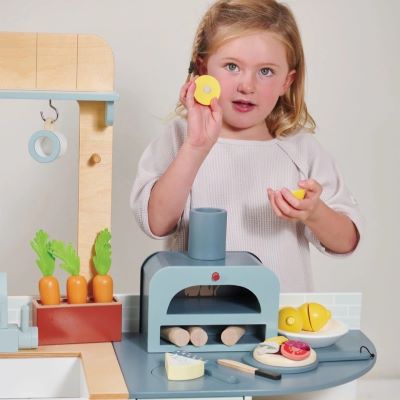 Zestaw dla młodych kucharzy z mnóstwem dodatków: od pizzy z rzepami, przez cytryny do krojenia, aż po włoski dzbanek do kawy. Dwie części, dużo przestrzeni roboczej i wiele możliwości zabawy – solo lub wspólnie z innymi.