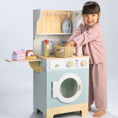 Zabawa w pranie może być zaskakująco fascynująca – zwłaszcza gdy można włożyć tabletki do pralki, ustawić cykl prania, rozwiesić ubranka i na koniec je wyprasować. Wszystko w formie, która wspiera samodzielność i znajomość codziennych rytuałów.