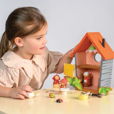 Mały domek w formie karmnika, a w nim ptasia mama Ruby, jej córeczka Rosy i gniazdko z jajkiem, z którego zaraz coś się wykluje. Wokół toczy się codzienne życie: wieszanie pościeli, przygotowywanie jedzenia, troska o młode. To świetna przestrzeń do zabawy w rodzinę, do tworzenia historii i budowania relacji między bohaterami. Dzieci w naturalny sposób uczą się opiekuńczości i empatii – poprzez zabawę, która odzwierciedla znane im sceny z domu. Rozkładana scenografia sprawia, że można „wejść do środka” tej historii i tworzyć nowe wątki każdego dnia.